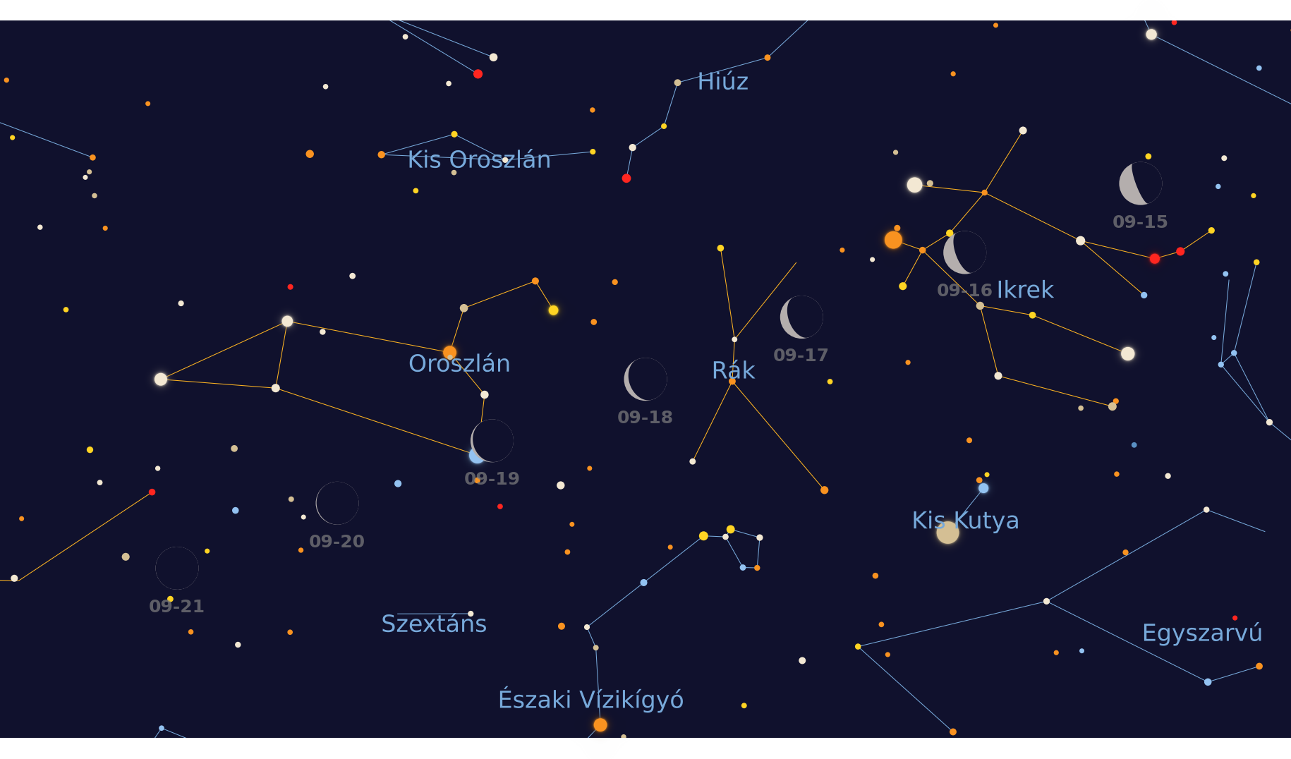 A Hold pályája a csillagos égen 2025. szeptember 15. és 21. között.